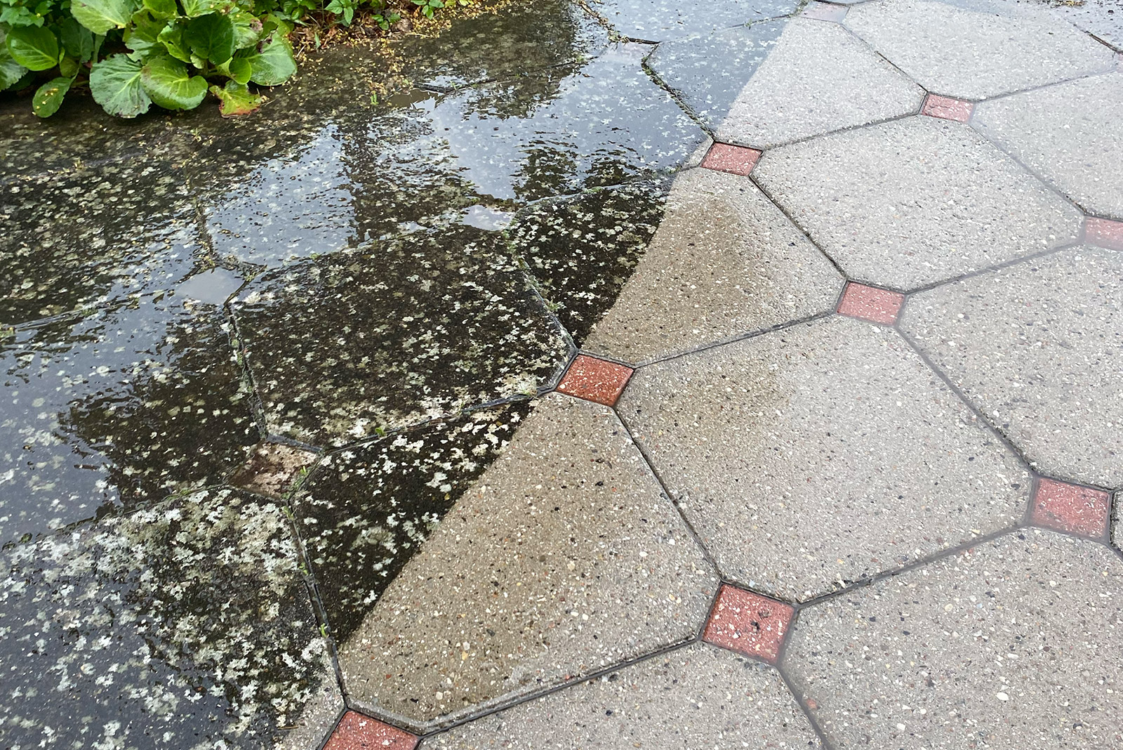 Når du står og kigger på dine algebefængte fliser, kan det være svært at forestille sig, at vi kan rense dem, uden at bruge nogle meget skrappe og farlige kemikalier. For prøver du at fjerne algebelægningen med f.eks. et ukrudtsbrænder, en skovl eller et hakkejern, opdager du hurtigt, at du ikke kan få den helt af. Der bliver ved med at sidde et tyndt lag, du er nødt til at skure af med en stålbørste. Men selv efter sådan en behandling, går der ikke længe, før algerne begynder at gro igen.